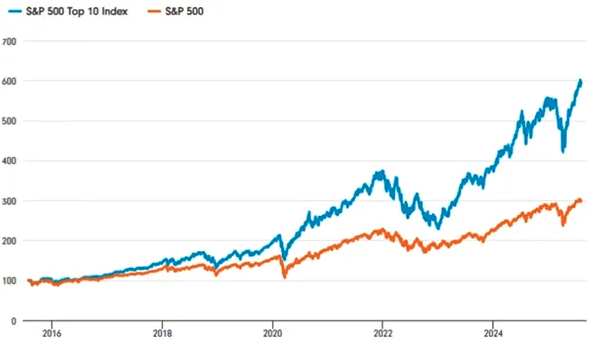 Had you invested $100 in that main market back in 2015, you would have $300 now. Not bad. But had you invested in just the top 10, you would have had $600, largely driven by the mega-caps.