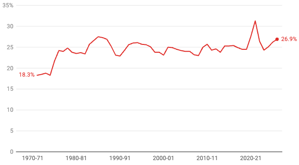 Federal government spending has fluctuated between 23% and 27% of the economy (gross domestic product or GDP) since the mid-1970s. The exception was a spike during the COVID pandemic. Its current level is not particularly unusual.